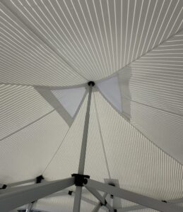 テント内を明るくするためにストライプ柄のアイボリー色に改良いたしました。